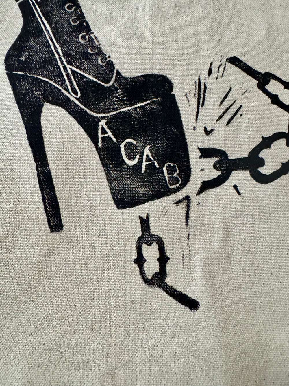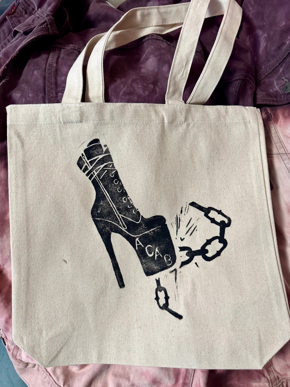 13.5" ivory canvas tote bag in 100% cotton. stamped with black ink of a stiletto-heeled boot with ACAB carved into the platform smashing a chain.